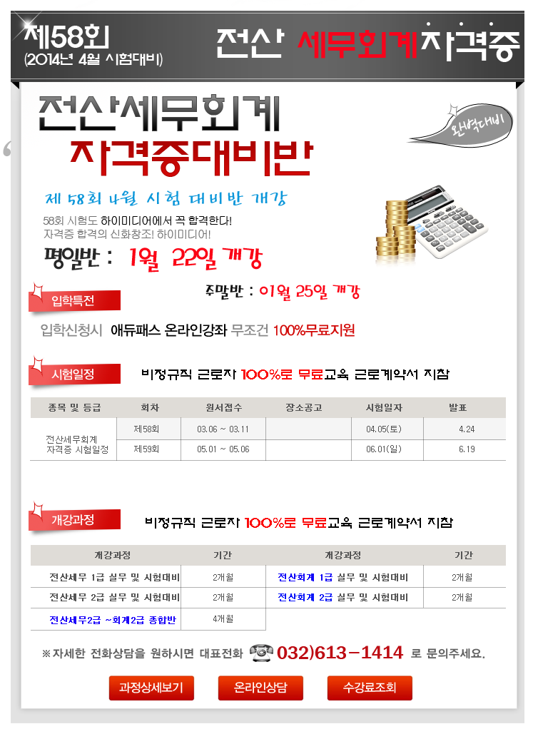 [공지사항]2014년 58회 전산세무회계 자격시험 대비반 개강일 공지!